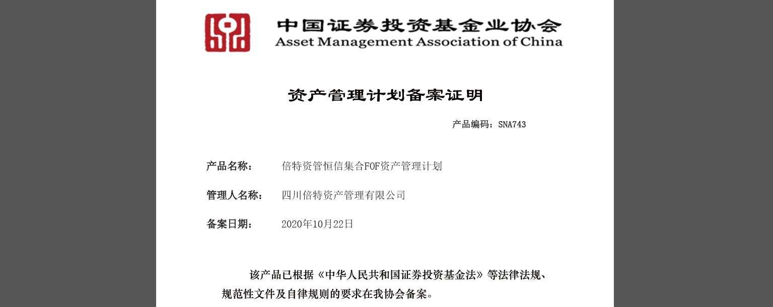 2020年10月21日,倍特期貨有限公司(以下簡稱“倍特期貨”)資產(chǎn)管理子公司——四川倍特資產(chǎn)管理有限公司(以下簡稱“倍特資管”)發(fā)起設(shè)立的資產(chǎn)配置策略私募FOF產(chǎn)品“倍特資管恒信集合FOF資產(chǎn)管理計劃”成立,并于10月22日通過中國證券投資基金業(yè)協(xié)會備案。瀏覽 : 8819分享